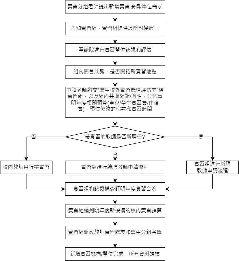 實習教師相關 新增實習機構(單位)流程 流程圖 學生校外實習機構評估表(範本) 機構環熟相關 教師醫院環熟公文進度表範本 實習機構環境熟悉天數要求 新進實習指導教師訓練手冊 其他相關 (實習前)衛福部報備支援線上申請 衛福部支援報備教學(無卡使用) (實習後)實習教師、實習機構、實習課程滿意度調查表 校安電話資訊-中央校區校安電話:03-8560505、建國校區校安專線: 03-857-1463